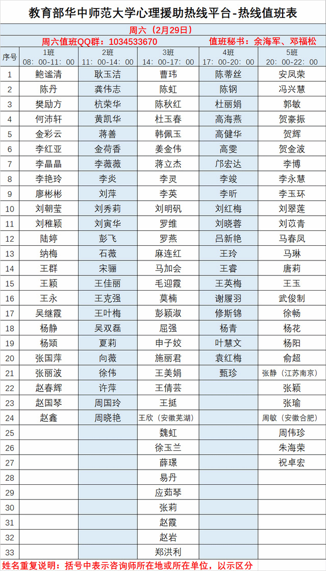 2月2日,芜湖市成立抗疫心理援助热线团队,主要为市内受到疫情影响各类人员提供情绪疏导、心理支持、危机干预。杭荣华教授作为芜湖市心理咨询师协会副理事长,两次为该团队提供线上培训和督导。另外,2月21日,教育部发布《关于支援“教育部华中师范大学心理援助热线平台”建设的通知》,心理学教研室有5名党员主动报名志愿参加(另外四院4名)。2月29日杭荣华教授和王欣老师率先作为志愿者开展面向全国的心理援助热线工作(提前一天排出援助名单)。