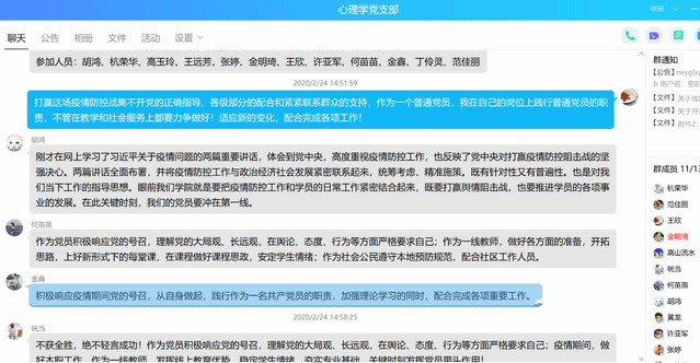 “不忘初心,牢记使命”主题教育阶段性教育结束后,心理学党支部感到疫情发生后的使命在肩,牢记师生身心健康的中心,心心相印,齐心协力,把抗疫和教学、科研工作结合起来。教师们在利用专业特长开展心理援助抗疫的同时,积极参加网络教学培训,开学后认真开展网络教学;有的教师结合疫情在思考科研课题,“我们能干点什么,我们能干好什么”;教师们通过网络相互咨询抗疫、教学、科研等问题,实现心与心的沟通。
