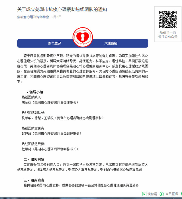 四、积极投身社会心理服务,与芜湖人民和湖北人民心心相印
