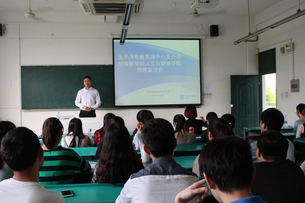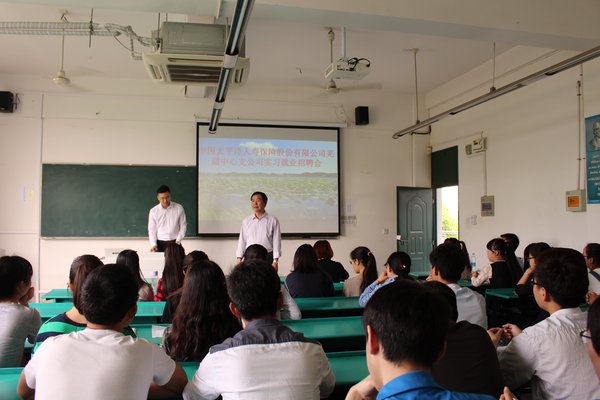 抓好实习助就业,实践育人谋未来。为切实做好实习、就业服务工作,5月6日上午,谈球吧于2206教室组织召开中国太平洋人寿保险有限公司芜湖市中心支公司实习、就业招聘宣讲会。邀请公司培训部讲师、门店项目负责人解钢进行招聘宣讲,谈球吧经理胡鸿、保险学教研室主任俞彤、公司秘书吴映辉、2013级辅导员张欣慧参会,2013级保险学专业全体员工和2012级部分毕业生到场参加并进行交流互动。会议由胡鸿主持。